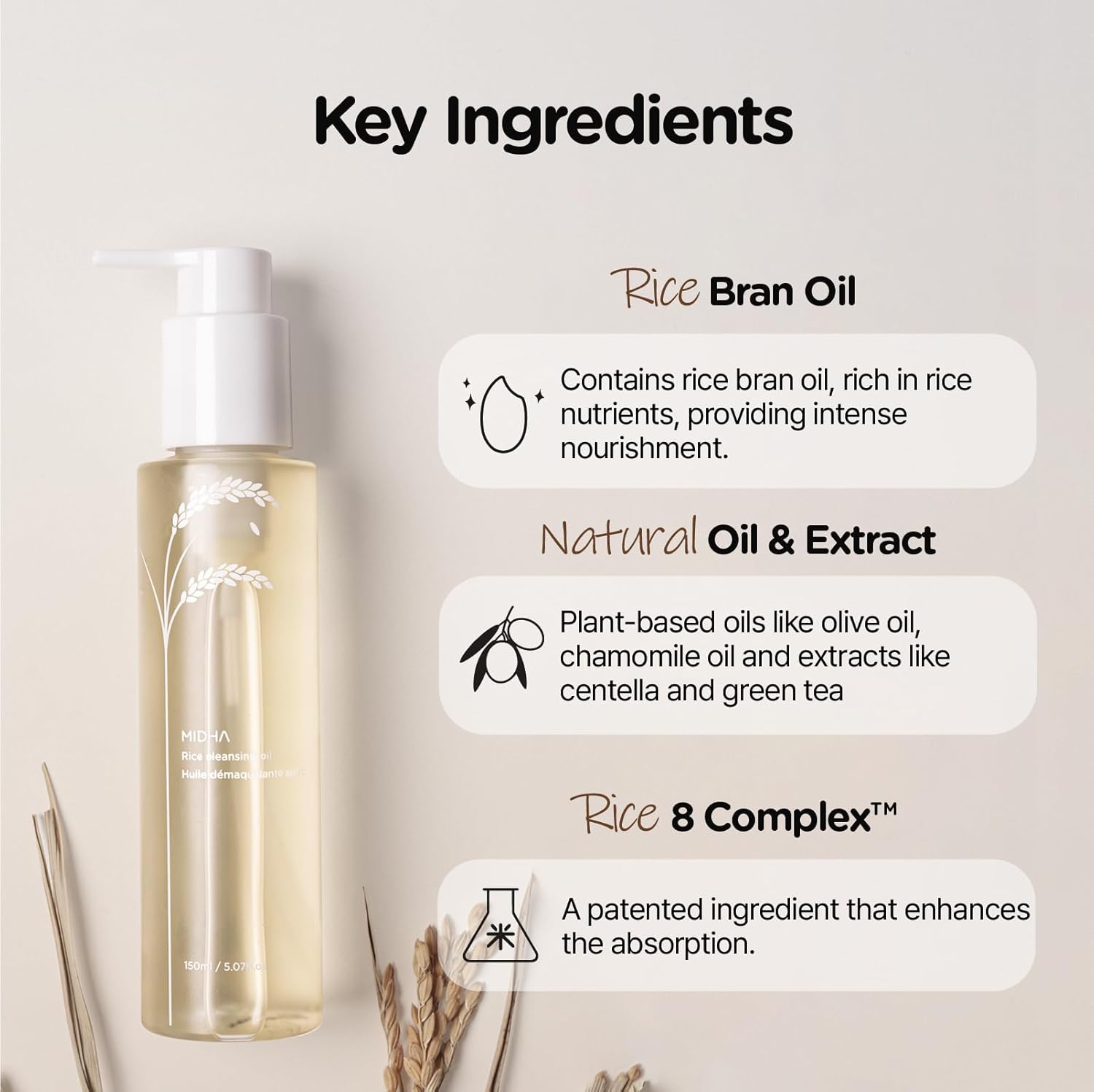 - Korean Rice & Natural Oil Blend – A nourishing oil blend featuring rice bran oil, which contains 66% of rice’s nutrients, combined with plant-based oils to gently cleanse while maintaining moisture.