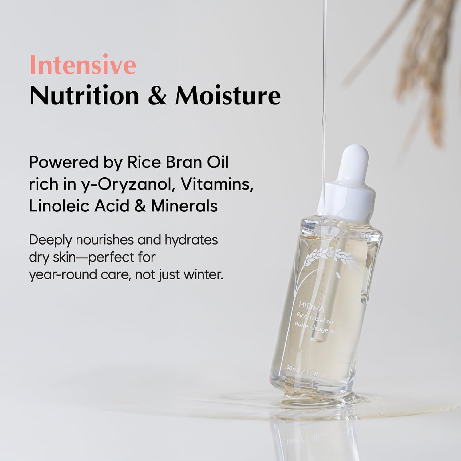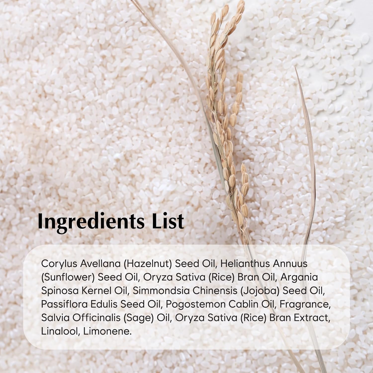 - 1. Natural oil 99.5% 2. Precious rice bran oil which can be occured only 1% from rice grain, but contains 66% of full rice nutrients. 3. Deeply moisturizing and nourishing the skin 4. Full of vitamins and anti-oxidant composition : Rice bran oil, hazulnut oil, sunflower oil, argan oil, jojoba oil, passiflora edulis seed oil, sage oil 5. Relaxing aromatherapy effect 6. Non sticky and quick absorption