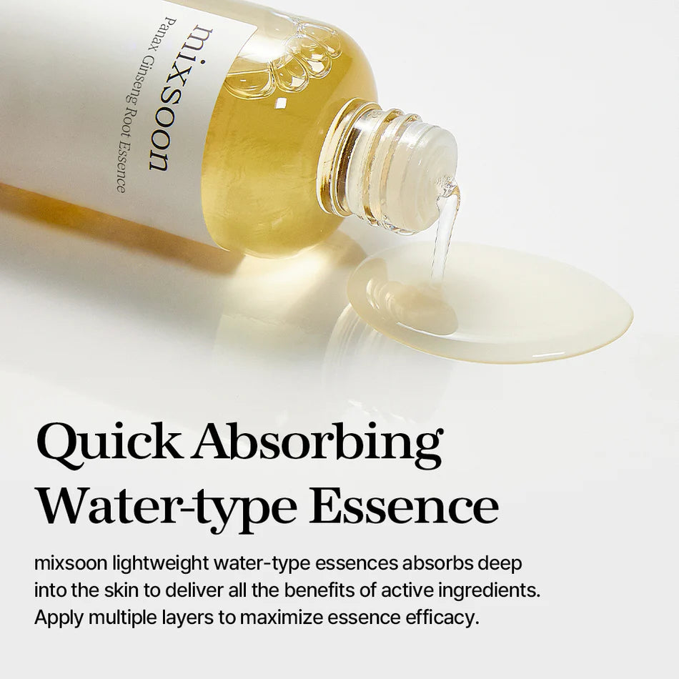 - mixsoon Panax Ginseng Root Essence is enriched with 100% Korea's iconic Panax Ginseng Root Extracts, also known as Red Ginseng, and is designed to reduce the appearance of fine lines and wrinkles to give the skin a youthful complexion.